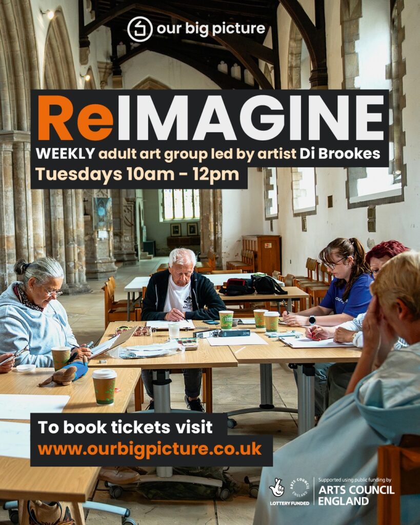 ReIMAGINE adult art group Join us for expert tuition from artist Di Brookes where you will be supported to develop your practice and techniques using a range of mediums to suit you. ReIMAGINE is suitable for all abilities and basic materials are provided; please do bring any preferred materials along! 🗓️ Starting Tuesday 7th October